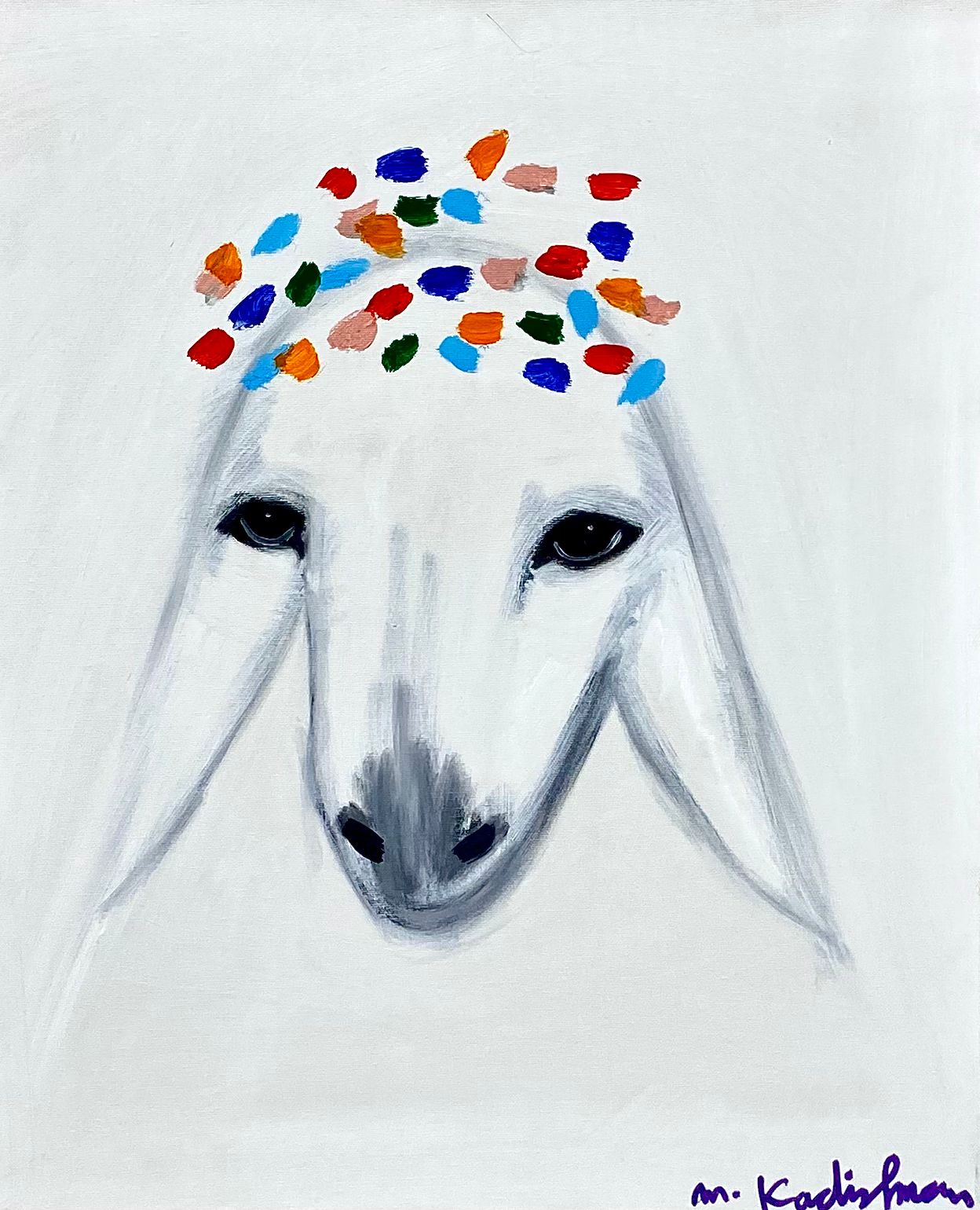 ציור מקורי של כבשה לבנה עם כתר על הראש, הציור הכי קלאסי של קדישמן,